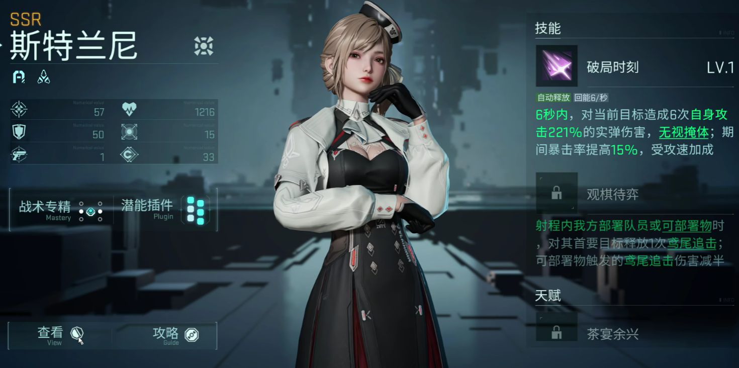 斯特兰尼在游戏当中,可以对当前目标造成一次基于自身攻击倍率为221%的真实伤害,同时无视掩体,期间暴击率还会提升15%,是一个攻速流的输出型角色。