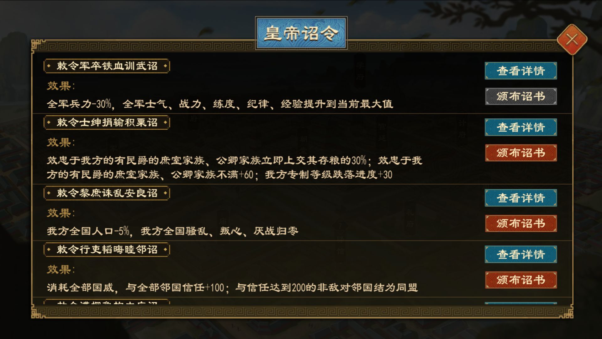 发起敕令诏书后,势力将在短期内获得强力的机制效果,各敕令诏书消耗不同的中朝积累,拥有不同的应用方向。
