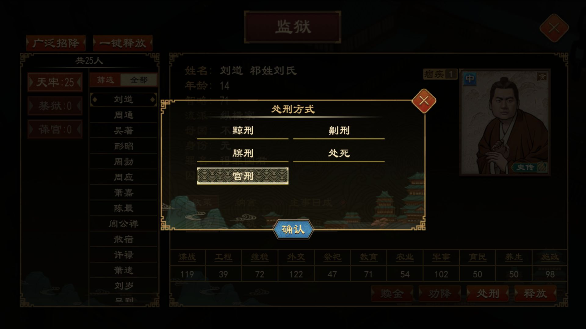 其中,可在监狱中对人物处以宫刑,处刑成功对应人物将负有“阉伤”,处刑失败对应人物将死亡。