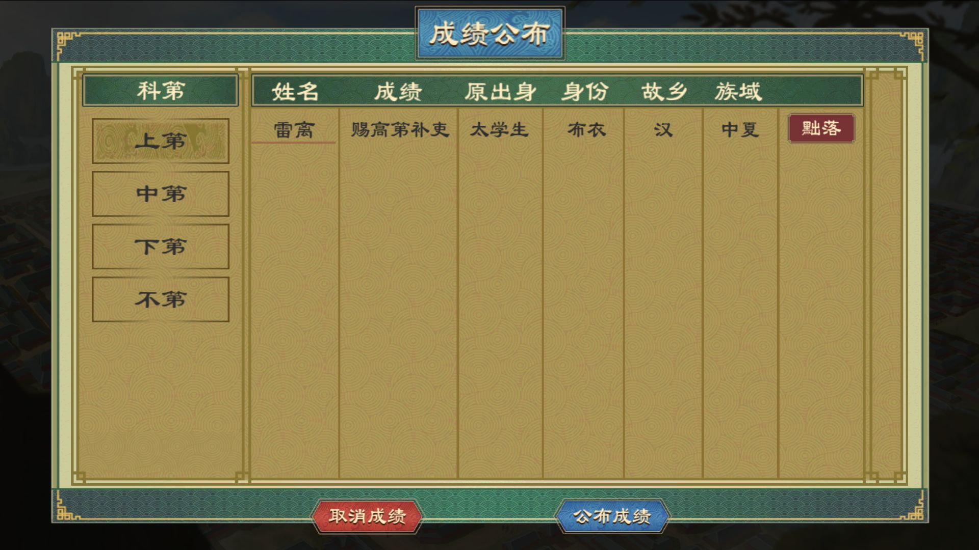 2、通过察举的方式,挖掘我方庶士家族中的成员,授予“知兵法”、“孝廉”等buff标识并进入郎署,从而可以将获得相关buff的人物任命至对应官职上