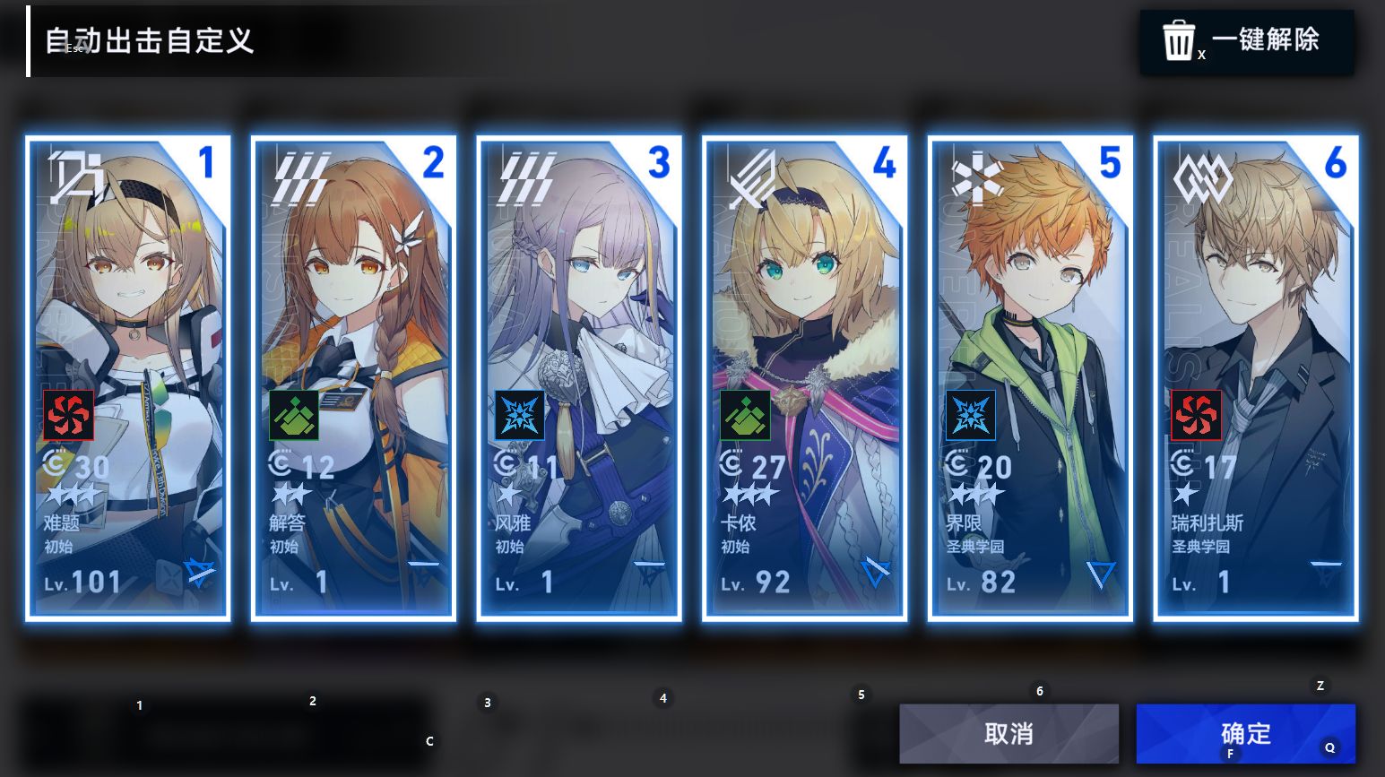 《溯回青空》前期阵容推荐“2输出 2回能 1治疗 1辅助”的均衡搭配。输出可选难题(远程)与卡农(近战),治疗用界限,回能由风雅、解答担任,辅助推荐雅利扎斯,按此配置可平稳渡过前期。