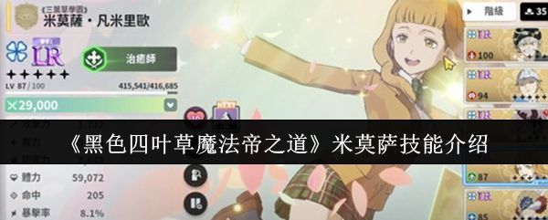 黑色四叶草魔法帝之道米莫萨技能是什么?不少玩家在组建队伍时都会关注这位角色的实战价值。作为游戏中人气颇高的治愈系角色之一,米莫萨不仅拥有SSR稀有度加持,更在技能机制上展现出强大的团队续航能力。她在原作中本就深受喜爱,而在黑色四叶草魔法帝之道的手游设定里,也完美还原了其辅助核心的定位。无论是推图还是挑战副本,米莫萨都能为队伍提供稳定的生存保障。
