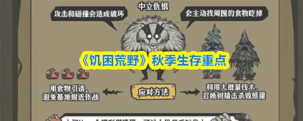秋季虽是最舒适的季节,却是为冬季囤积物资的关键时期。玩家需积极探图搜集资源,并在季节结束前3-4天备好冬装,同时警惕BOSS熊獾的威胁。下面是《饥困荒野》秋季生存重点!
