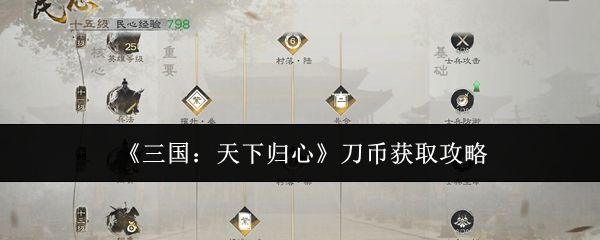 三国天下归心刀币怎么获取?在策略游戏三国天下归心当中,刀币属于十分关键的资源,它可以用来增强玩家的战力,也能用来购置各类珍稀物品及道具,那么三国天下归心刀币怎么获取呢,今天就来给大家讲解几种常见的获取方法,在游戏开荒阶段帮助大家迅速积攒刀币资源。
