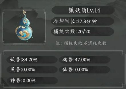 消耗“镇妖葫”次数,葫芦有冷却时间,可以增加次数,初始是20次,根据葫芦等级抓的宠物不同,我目前葫芦14级,可以抓魂兽,估计20级以后抓灵兽。