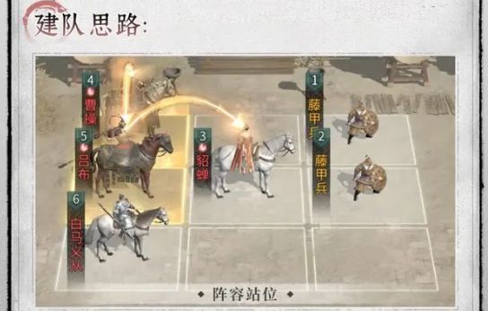 吕布自带范围伤害 折杀,只需要给足额增伤就可以打出爆发伤害。貂蝉是首选,其次蔡文姬便宜好用,稳定触发【鼎力相助】。