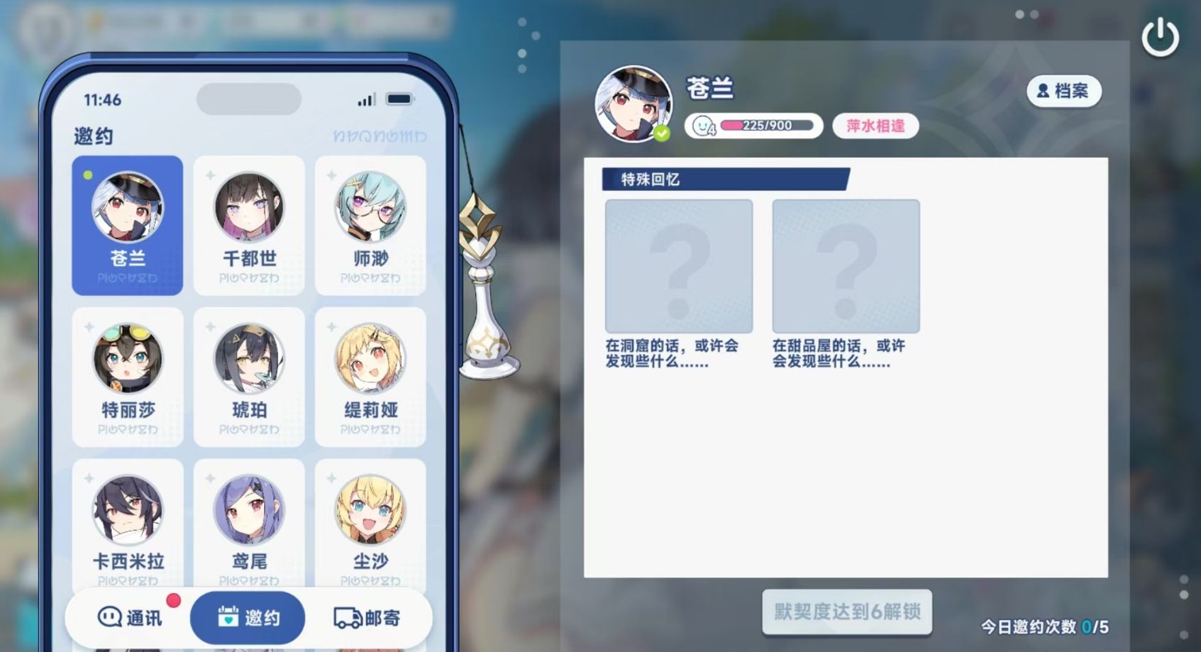 邀约是一项需要人们与角色默契度到达6级后,才能进行的玩法。玩家们每天最多能进行5次角色邀约,开启后会进入角色的专属剧情。剧情中若是出现特殊回忆,还会在剧情完成后收录到邀约系统中供各位随时去查看。邀约开启时,各位需要与角色一同完成剧情后才能拿满奖励,要是在邀约过程中退出,只能拿到最为基础的默契度奖励,所以各位最好在空闲时间开启与角色的邀约,确保每次邀约时都能将奖励拿满。