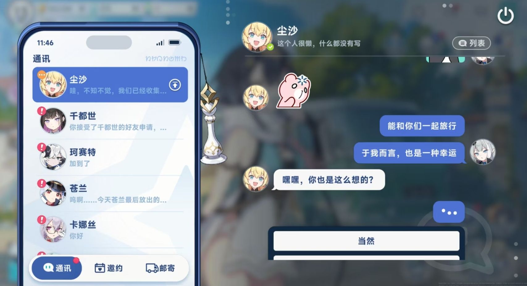 心链系统主要由通讯、邀约和邮寄三大功能组成,里边只会出现玩家已获得的角色。其中,通讯功能相当于聊天,它可让各位与任何一名角色进行对话,每阶段的对话完成后,还能拿到星之砂奖励。该功能每天使用的次数不受任何的限制,各位若是有特别喜欢的角色,可用她们头像后方的置顶功能,让她们能排在列表的最上边,方便自己去查看该角色是否有新的聊天话题。同时,各位在点开各角色的聊天界面后,还可在左上的列表里,去查看自己与角色之前所聊的全部内容。