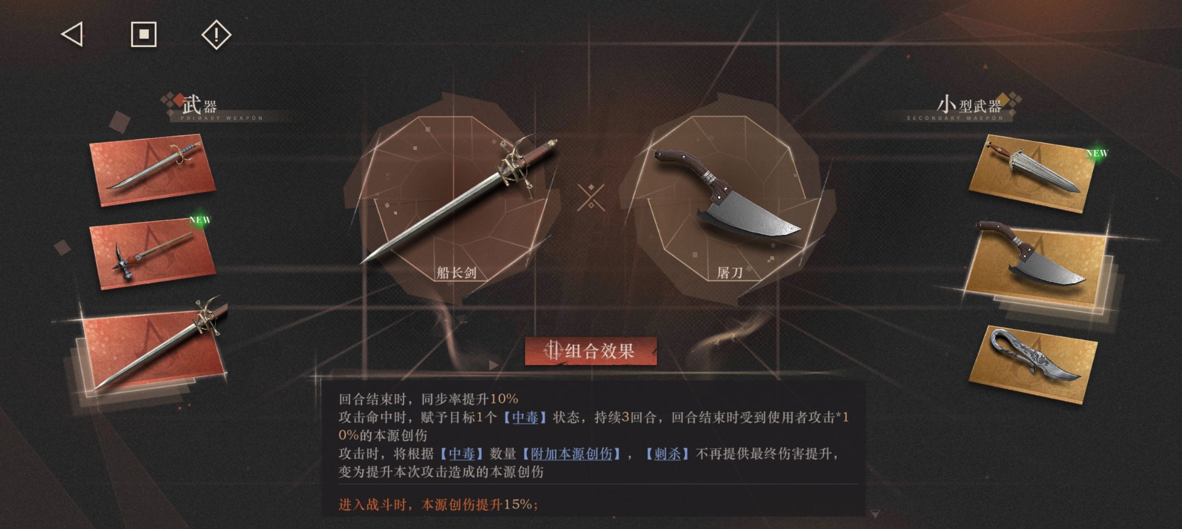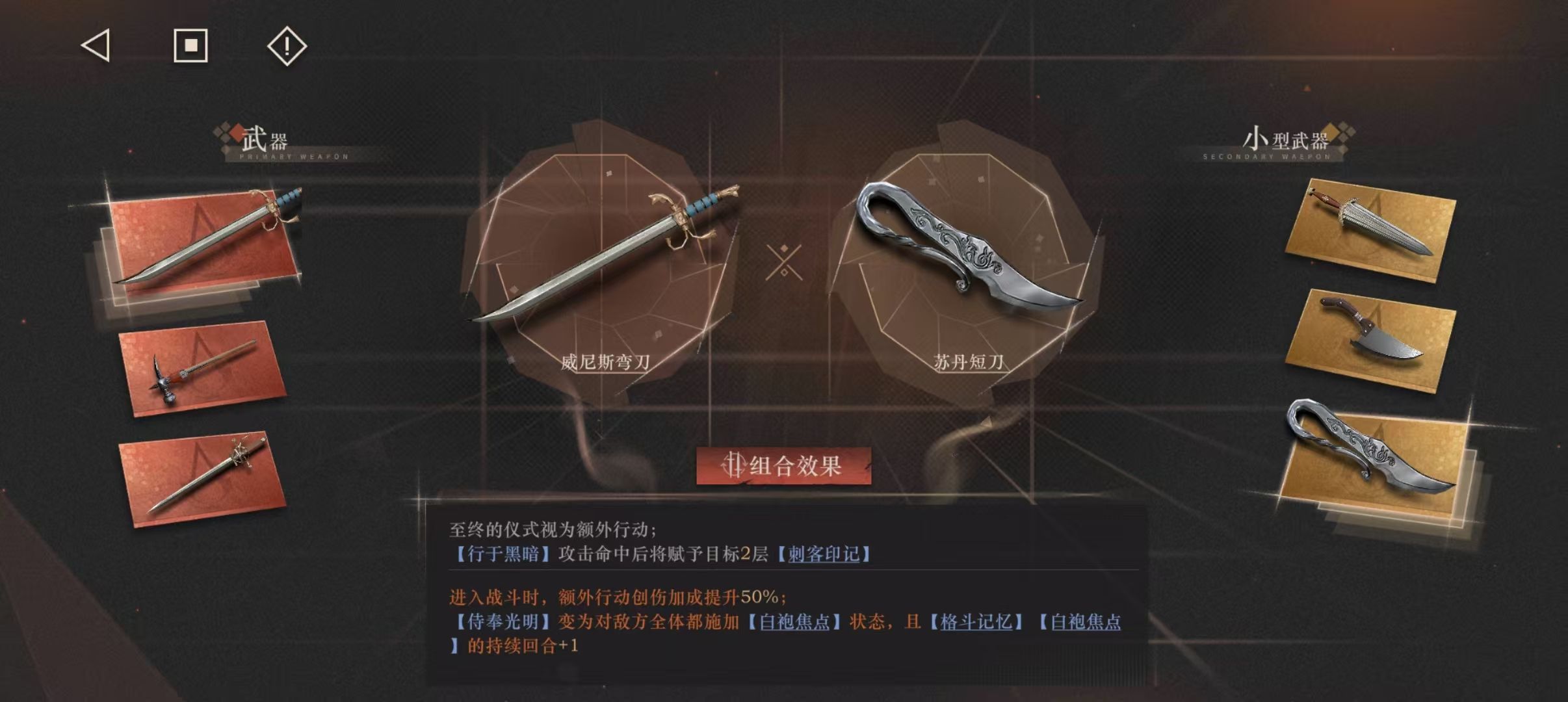 武器选择:主武器威尼斯弯刀 副武器清杂选屠刀,无生存压力选短刀,高压选五指剑