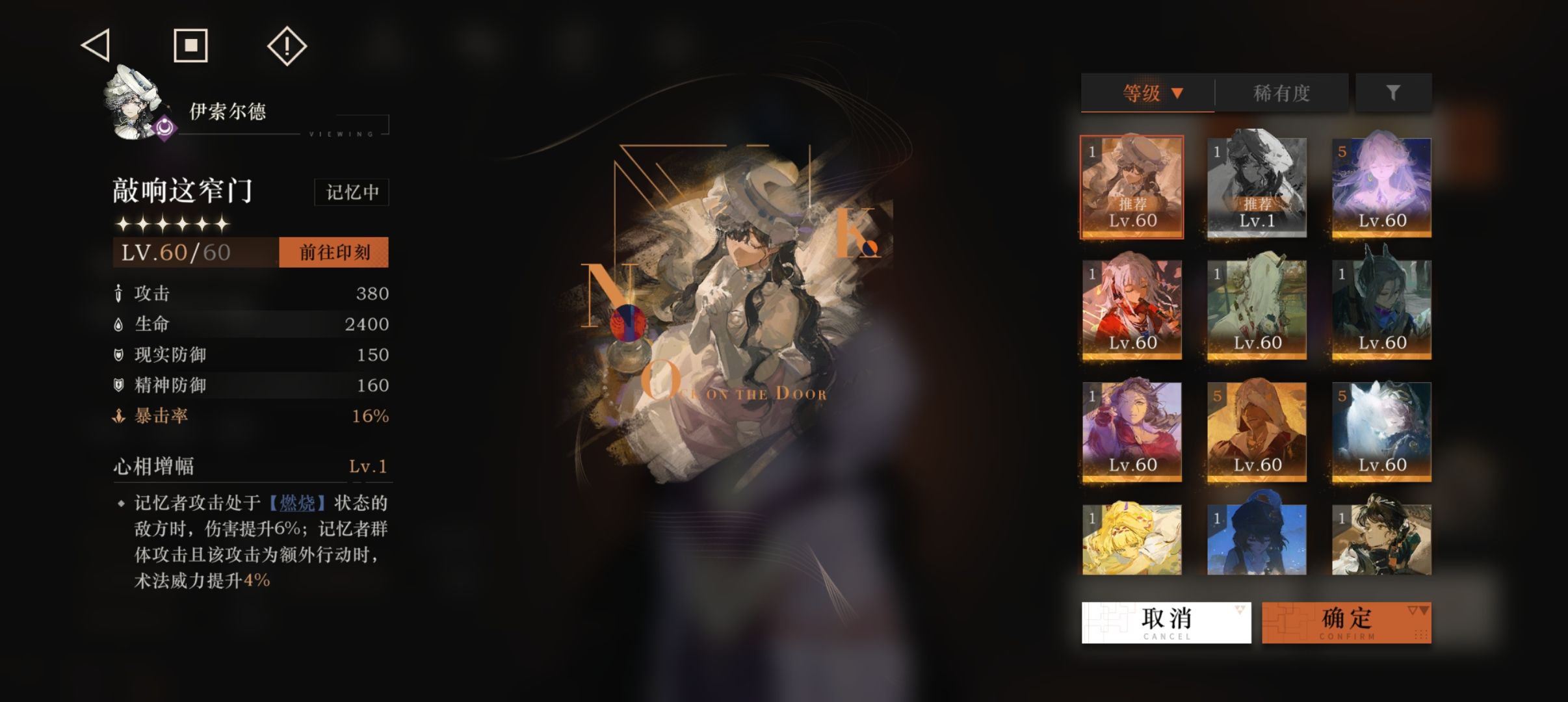 伊索尔德心相可以选择无意识梦魇(偏辅助与功能性)与敲响这窄门(偏输出)无意识梦魇(前线观察室等级达到70级可免费领取)更偏向于辅助与功能性,如果希望伊索尔德打出更高输出可选择敲响这窄门,两者表现差距不算太大,大家可以根据自身情况选择