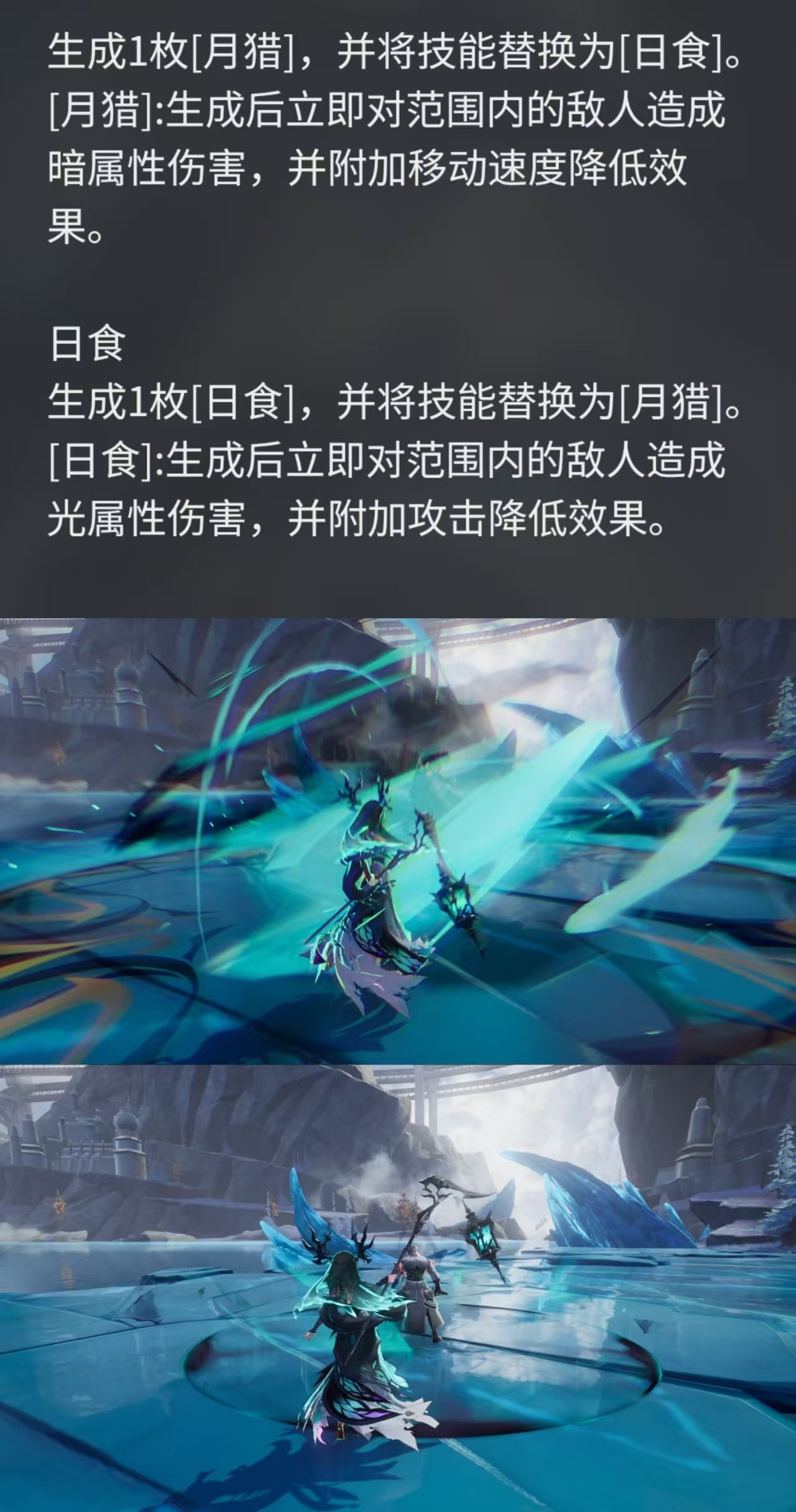 小技能光属性【日食】可以降低敌方攻击力,暗属性【月猎】可以减速。放技能之后有概率再生成一次技能。