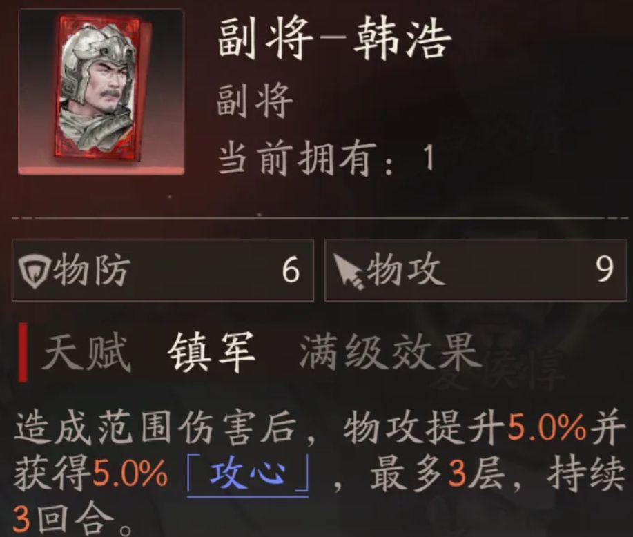 韩浩在游戏当中,是曹魏阵营的高品阶副将角色, 基础物理防御为六点,基础物理攻击为九点,他的主要技能是“镇军”,在造成aoe伤害之后,可以使得主将单位,提升5%的物理攻击倍率,同时附带有3.2%的攻心效果,该效果最多可以叠加三层,持续时间为三个回合。 韩浩还拥有韬略的技能效果,在战斗时,如若主将单位发动反击,那么伤害会增加1.5%,同时附带有伤害减免的效果,该效果为2%。 倘若玩家想要获取韩浩这一个角色,则需要进入到游戏的仙人探宝玩法内,直接取得时之精,最后使用时之精在仙人探宝当中抽取。