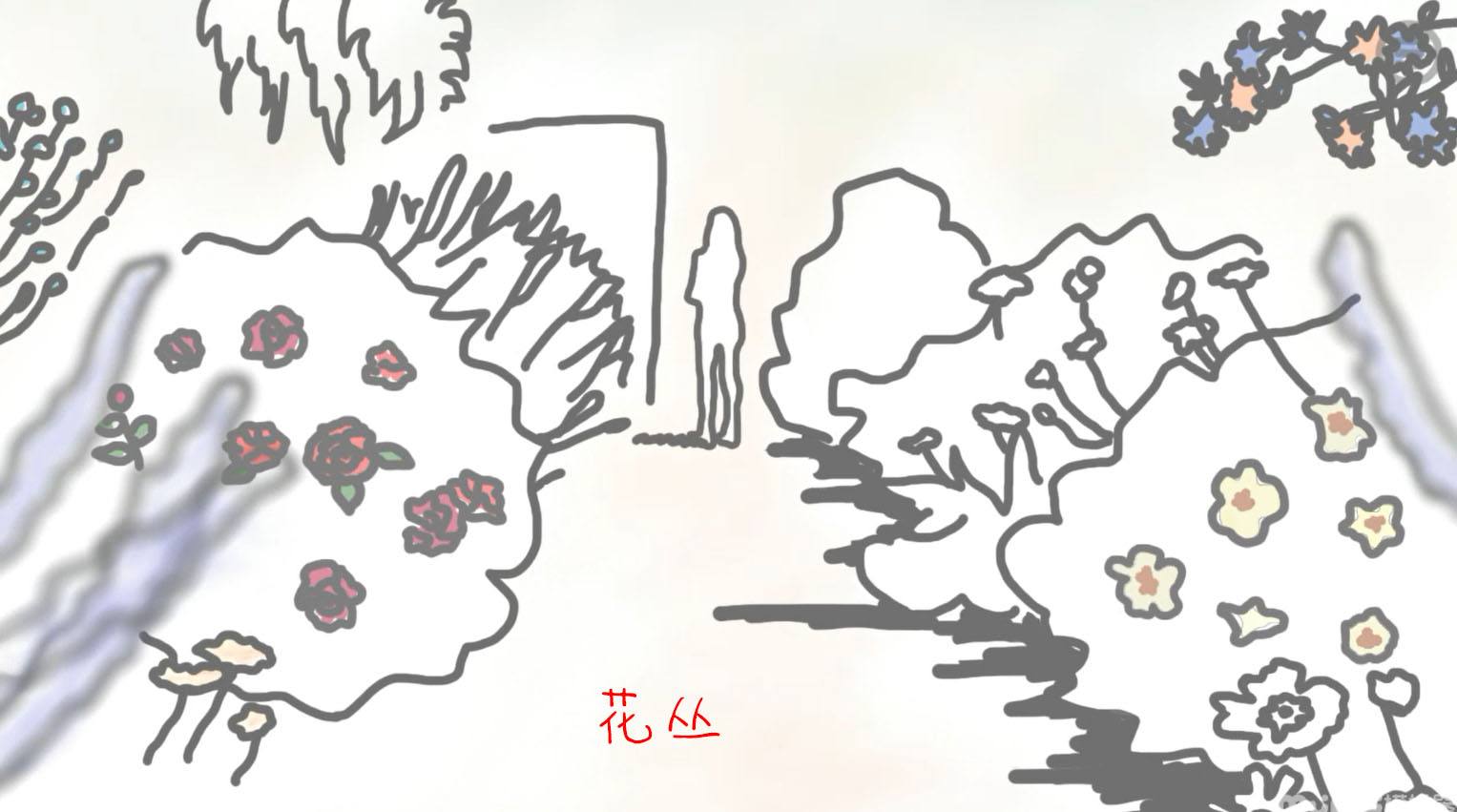由左到右的场景,分别为道路-花丛-院子