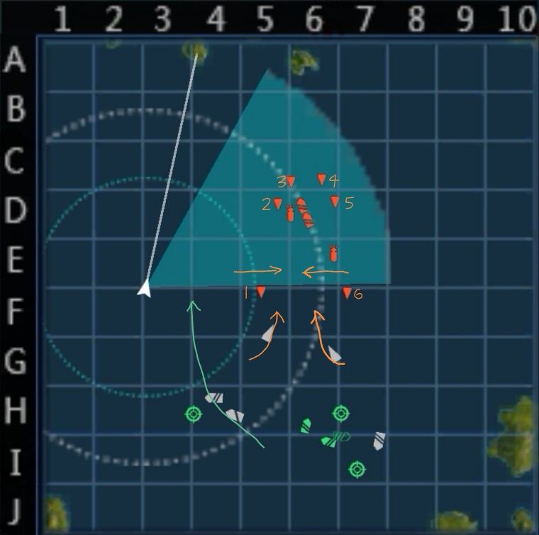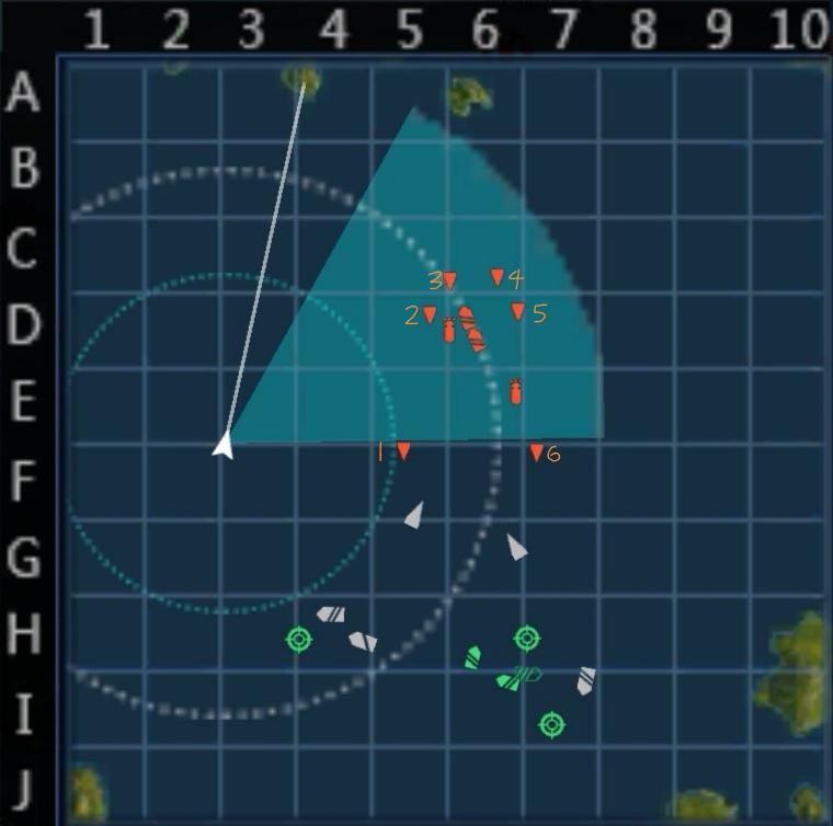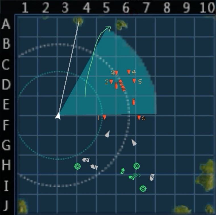 当空军基地被击毁后,主炮停火,等待自身隐蔽减小(注意,这里一定要等,防止自身被3号炮台点亮),然后延绿色箭头前进,并继续叠灾,但此时鱼雷的宽窄可以根据敌我距离进行调整。
