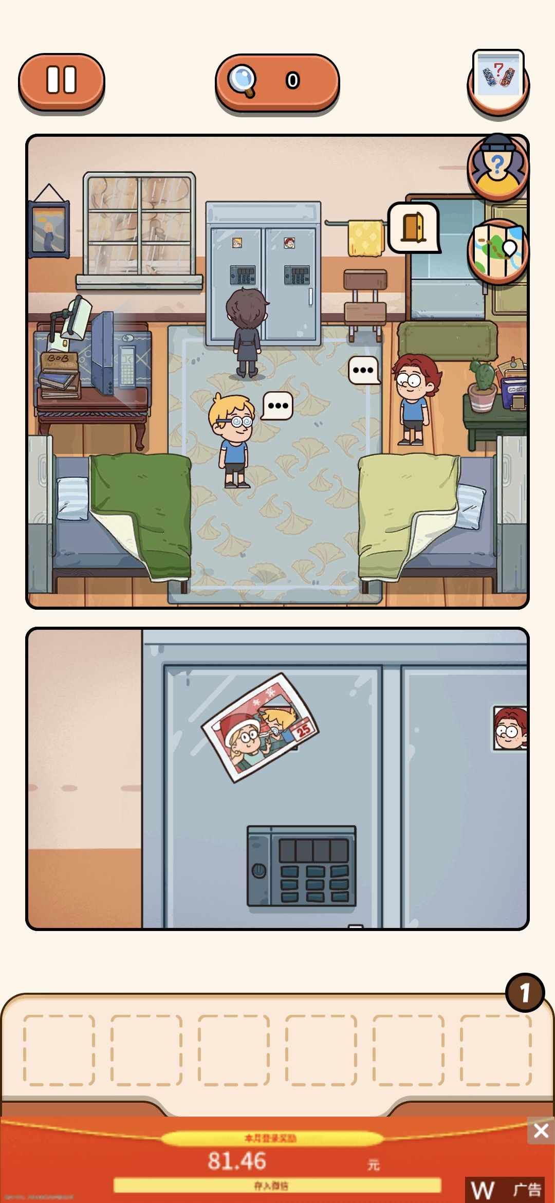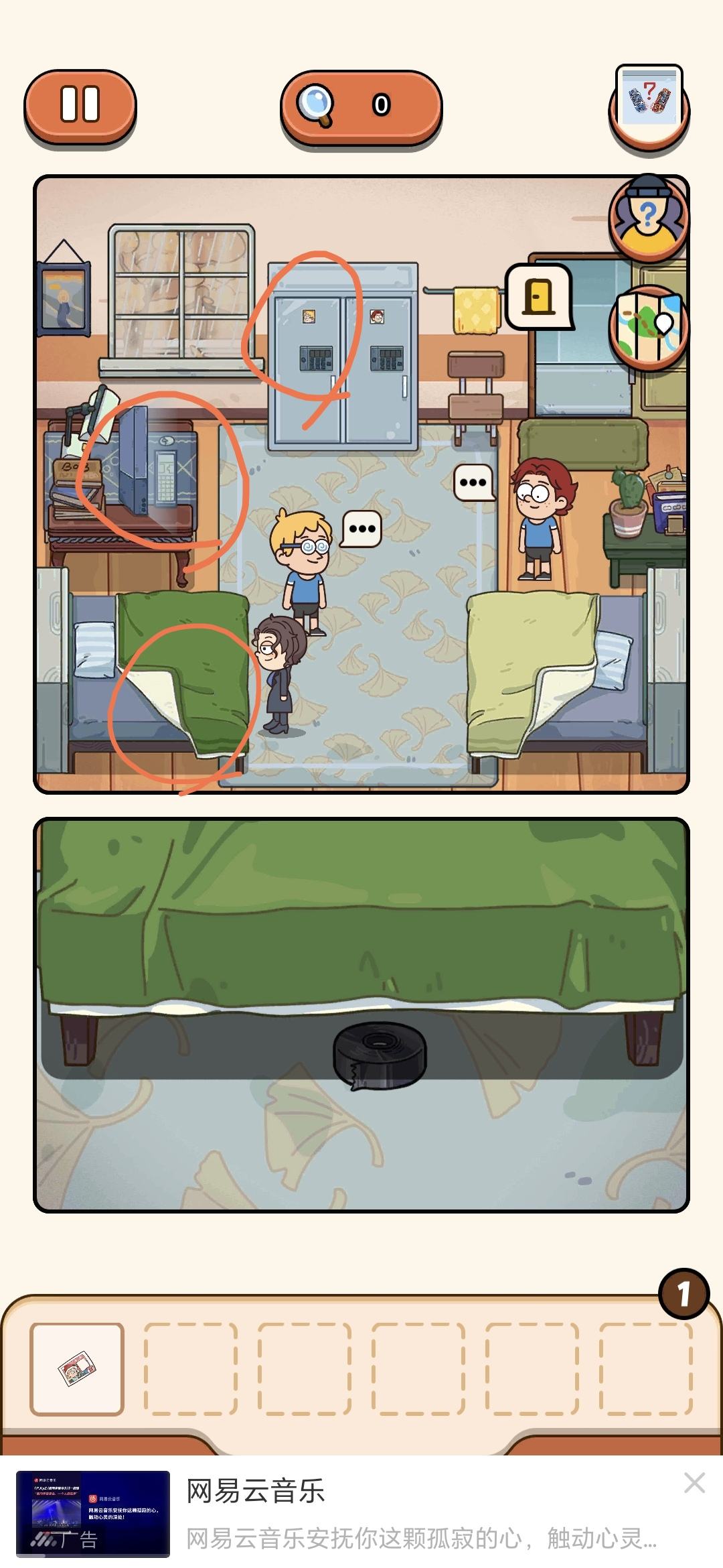 在鲍勃的床底下可以得到黑色胶带;在左边电脑可以获得线索(爆炸照片),密码在实验室黑板上,有一个公式前打了一个,密码是里面所含的数字62323;然后到衣柜处,里面移动从清洁工处获得的裁剪照片,使鲍勃衣柜上的照片处于被裁剪照片的空缺处,就能使照片恢复完整,得到清洁工与鲍勃的合照,而合照的日期(圣诞节12月25日)就是衣柜的密码,打开衣柜可以得到教授的权限卡。