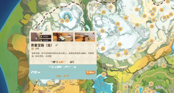 还有虫系宝箱位置是在信仰者村落的东北边。注意不要只看地面,可以抬头看一下木架的位置,在解锁时就需要重系精灵。主要的奖励就是无花果,还有虫系灵碎,如果玩家正在培养化蝶,那就需要这一些材料。