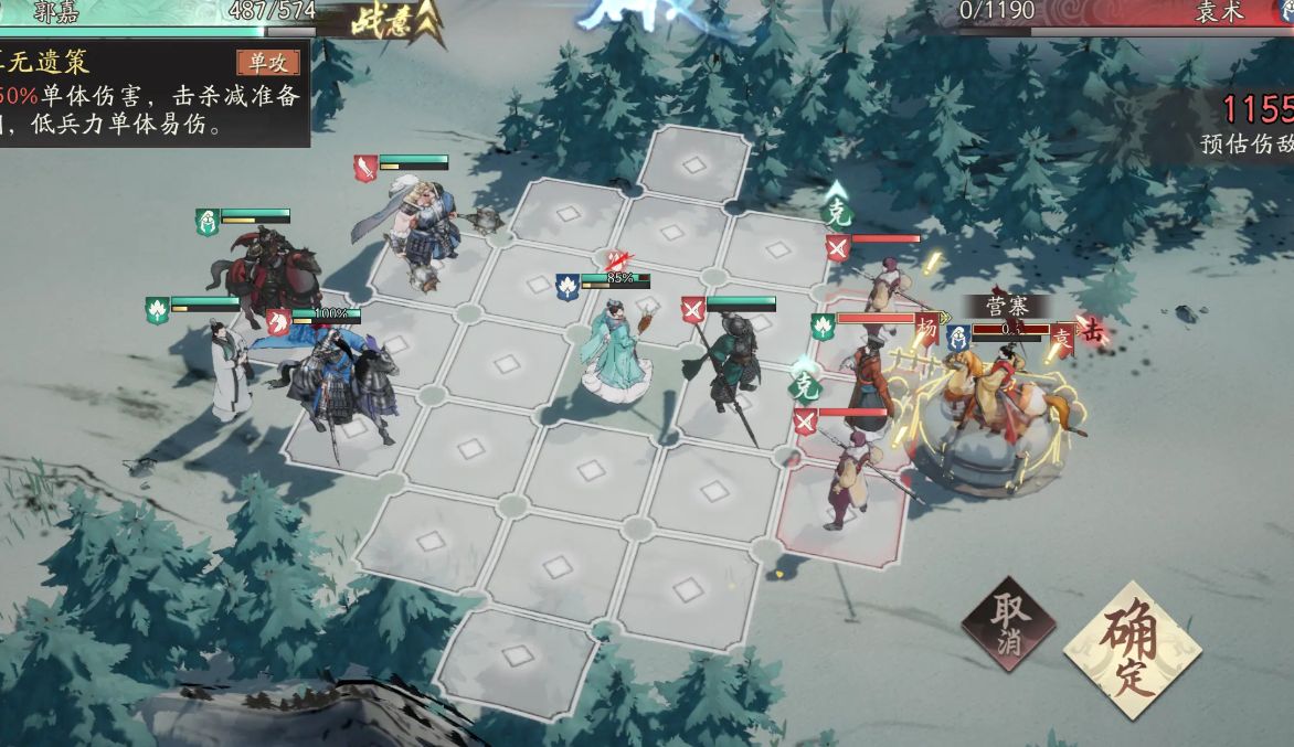 该章节的核心策略是,玩家需要率先使用骑兵占领敌方高地箭塔,随后使用自身的防御优势,直接绞灭敌方小兵,在小兵的阶段内,玩家需要尽可能的积攒战意和怒气,保证在第三回合袁术部队出现时,率领骑兵将其引至箭塔附近,随后所有角色释放怒气技能,展开一次剿灭。