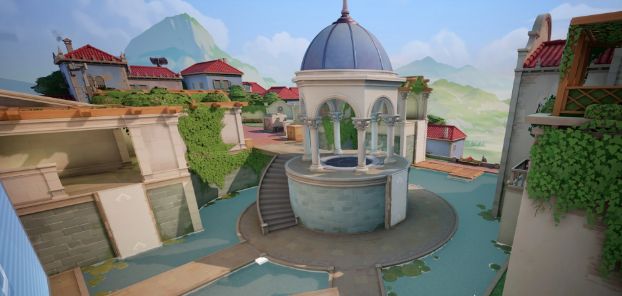 先来说一下b点,这是一个重要的地方,因为b点周围全部都是屋檐,那些有飞行能力的敌方角色就可以直接跑进来。但只要找对点位,就能够轻松的拿捏。建议直接在拱桥后面站在这里侧着身就可以看到前面的动静,而且还可以挡住大部分的攻。如果进攻方想要进来,那这里就是一个必经的飞行路线,玩家只要盯住那等到他们落地时还没有调整过来就可以直接开火,打得对方措手不及。