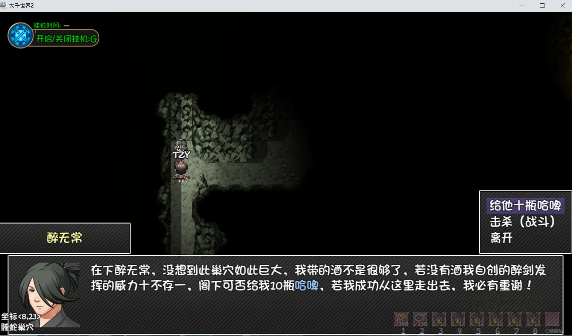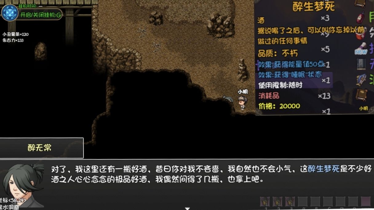 来这过完剧情后便可以准备所需物品了,要求隐身药剂,10个哈啤(任务需要),复活回复手段,后面一整段都不可以保存,在最后死了也要重头再来。(剧情会给你一个出洞用的符文,当想要出去时在第一层使用,否则符文会消失且不起作用,要重头再来)