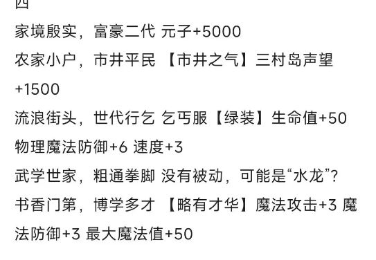 4.家境殷实,富豪二代 元子 5000(为什么这里选择元子,因为前期用元子的地方很多,比如筑基丹,做任务也需要;武学世家是自带野球拳,其实没必要练,前期所有门派都一样,不如王八拳过渡平滑,选择乞丐是睡梦罗汉拳,ps:一坨)