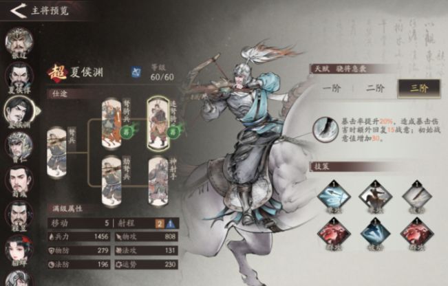 如果小伙伴们的手中比较缺远程输出型的角色,那么小编比较推荐的是夏侯渊,当升到二阶之后,他能够为队伍带来15%的暴击率加成,如果说你平时比较喜欢玩弓兵体系,那么夏侯渊绝对是一个必须要培养的角色,而如果说你手中的角色大多比较脆皮,急需一个治疗的话,那么夏侯淳就是你的首选了,升至二阶之后,它可以在残血状态下恢复32%的兵力。