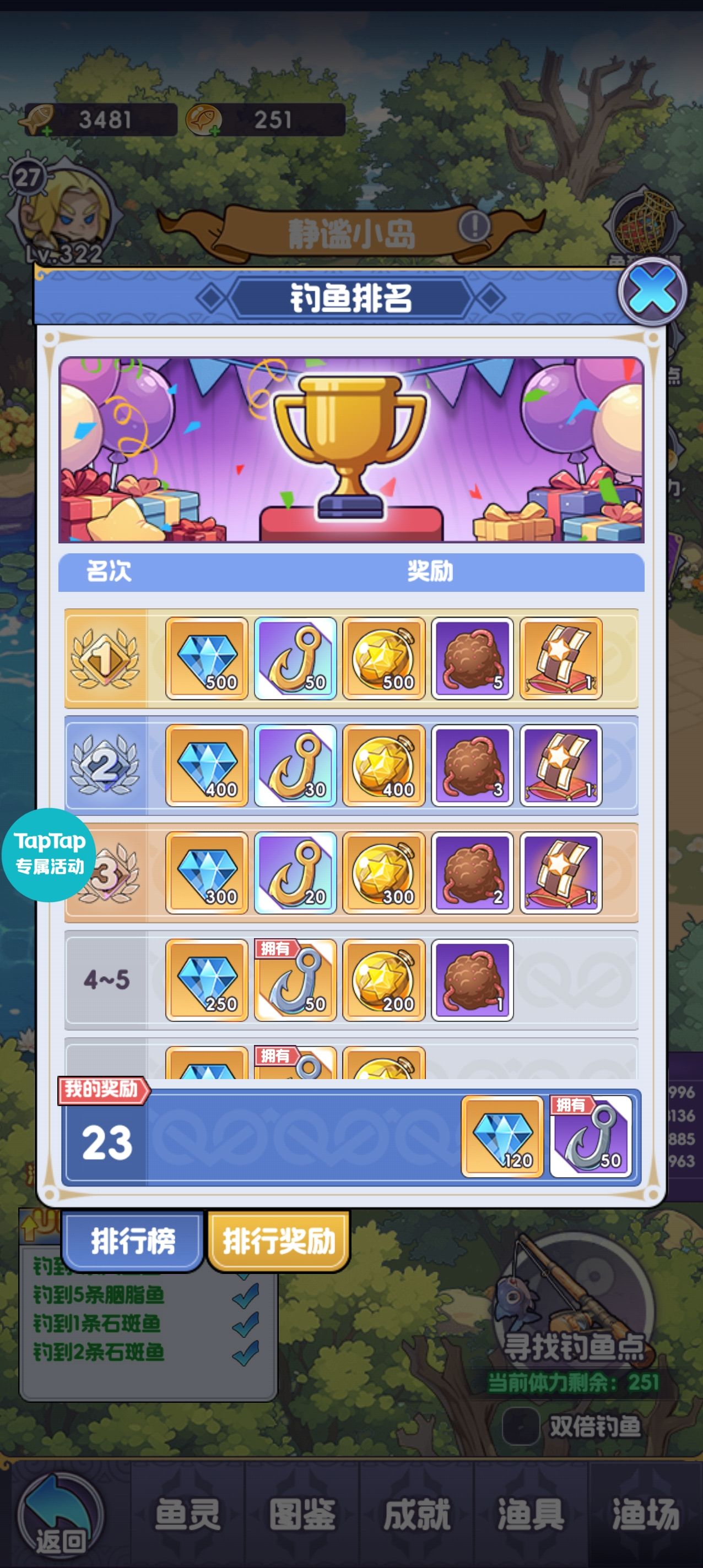 主要其实就是对钓鱼玩法进行了每日奖励加成,以及新增了限时排行榜。没有攒钓鱼体力也无所谓,之前提升钓鱼等级,到达高等级鱼塘钓鱼获得的鱼币也会更多,而记分原理是看你钓上来鱼的鱼币价值来进行算分。建议任务做完后前往目前解锁的最高等级鱼塘将每天体力钓完即可。如果没有鱼点可以在每天的12,18,21的官方鱼点钓鱼