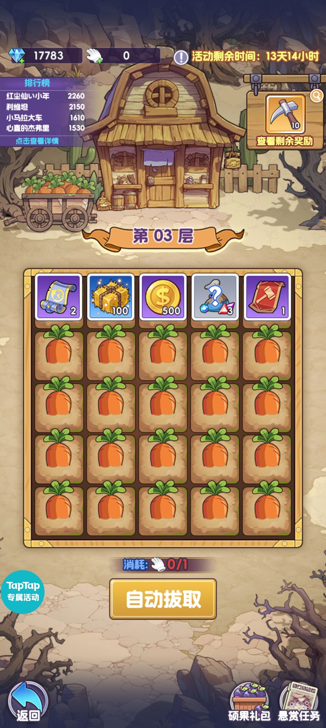 对标上次的幸运礼盒,奖池内有着各种基础物资,建议花钻购买硕果礼包里的3白手套。与礼盒区别在于多了层数以及每层自选奖励,自选奖励会随着层数增加越来越好。排名奖励虽然较差但后面层数的自选奖励会给创世藏品碎片很不错,推荐拿到大奖直接前往下一层,在第22层可以反复拔萝卜获取自选大奖,白手套不会溢出。