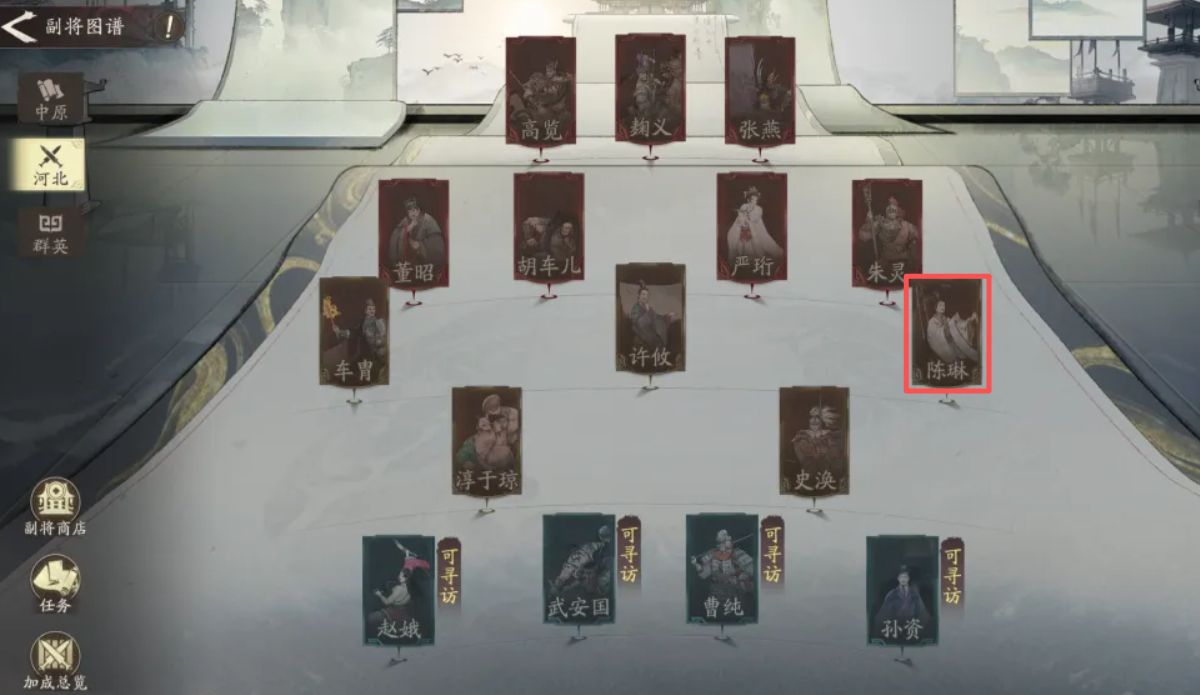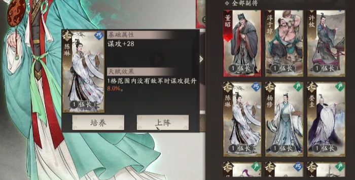 当然除了这个效果之外,陈琳没有其他的能力可以加成,所以目前相对来说能够带来的主将提升效果比较单一,如果大家想要用陈琳的话,前期去跟刘烨这样的主将搭配还是可以的,如果想要培养的话,建议还是挑选一些超品质的副将会更适合,目前在25的时候,其实就可以跟到副将列表当中选择,但是前提是一定在副将系统当中有点亮这个副将的图鉴才可以使用哦。