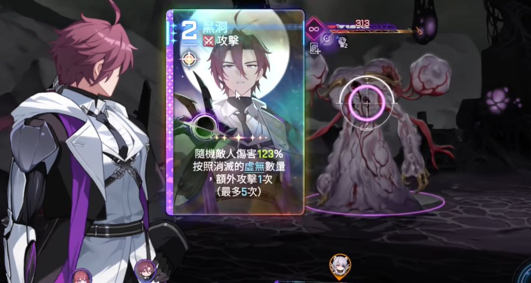 实际的战斗中释放的虚无黑洞技能对敌人造成的范围伤害是大家远想不到的,如果能够叠加虚无悖论使用,将会实现更高的增益效果,将攻击强化至30%。与团队成员共同作战,将会为队友们带来极强的生存能力,使队伍一直向前进攻敌人的领域。核心技能为虚无残影、消灭烙印,虚无残影在使用时需要消耗1AP便可造成240%的伤害,消灭烙印造成全体性伤害60%的同时,每一个回合都将会消灭一张卡牌,减少更多的能量消耗。战场控制能力是极强的,实现高伤害的同时确保了队伍的稳定输出和各方面的能力释放,是非常值得大家去体验的角色之一。