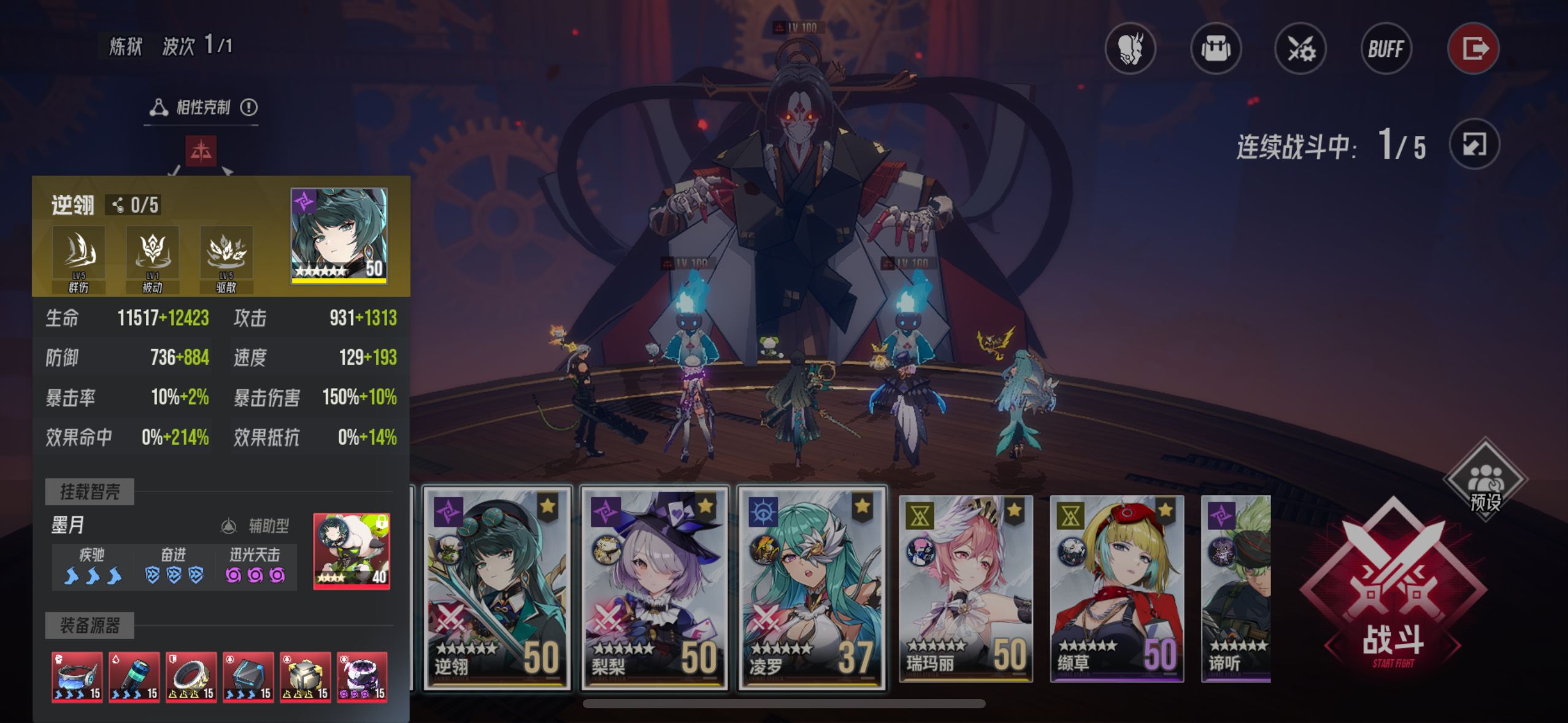 2、想要降低翻车概率就要在boss出手第三回合前结束战斗,也就是需要主c在boss出手第三回合前出手三回合两次大招加一次二技能加梨梨的协战,所以这里上了蝰蛇给boss减速buff,同时蝰蛇的减伤能更好保证队伍状态避免减员