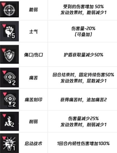 负面词条类指的就是减益的效果,其中包含5个属性,易伤类里面包括脆弱和痛苦,这两种属性可以让自己的角色遭受的伤害得到提高,并且会造成固定持续性的伤害,对角色的伤害力度是很大的。削弱士气类里面包括士气和削弱,这两个属性可以使伤害量减少1/4,但是发动时的效果层数将会减少一层。护盾限制类里面主要是以损坏这一属性为主的,这一属性将会使护盾的获取量减少50%。这样对护盾的伤害度将会降低一半。