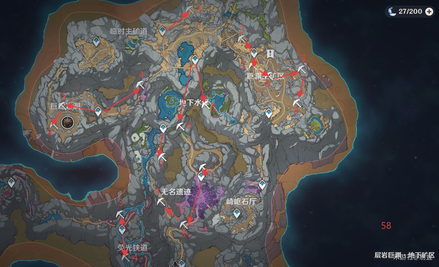 水晶块58个,层岩巨渊的水晶矿产量丰富,基本上每一堆矿石就能出2-3个水晶块,58个水晶块稳定产出120以上的水晶块